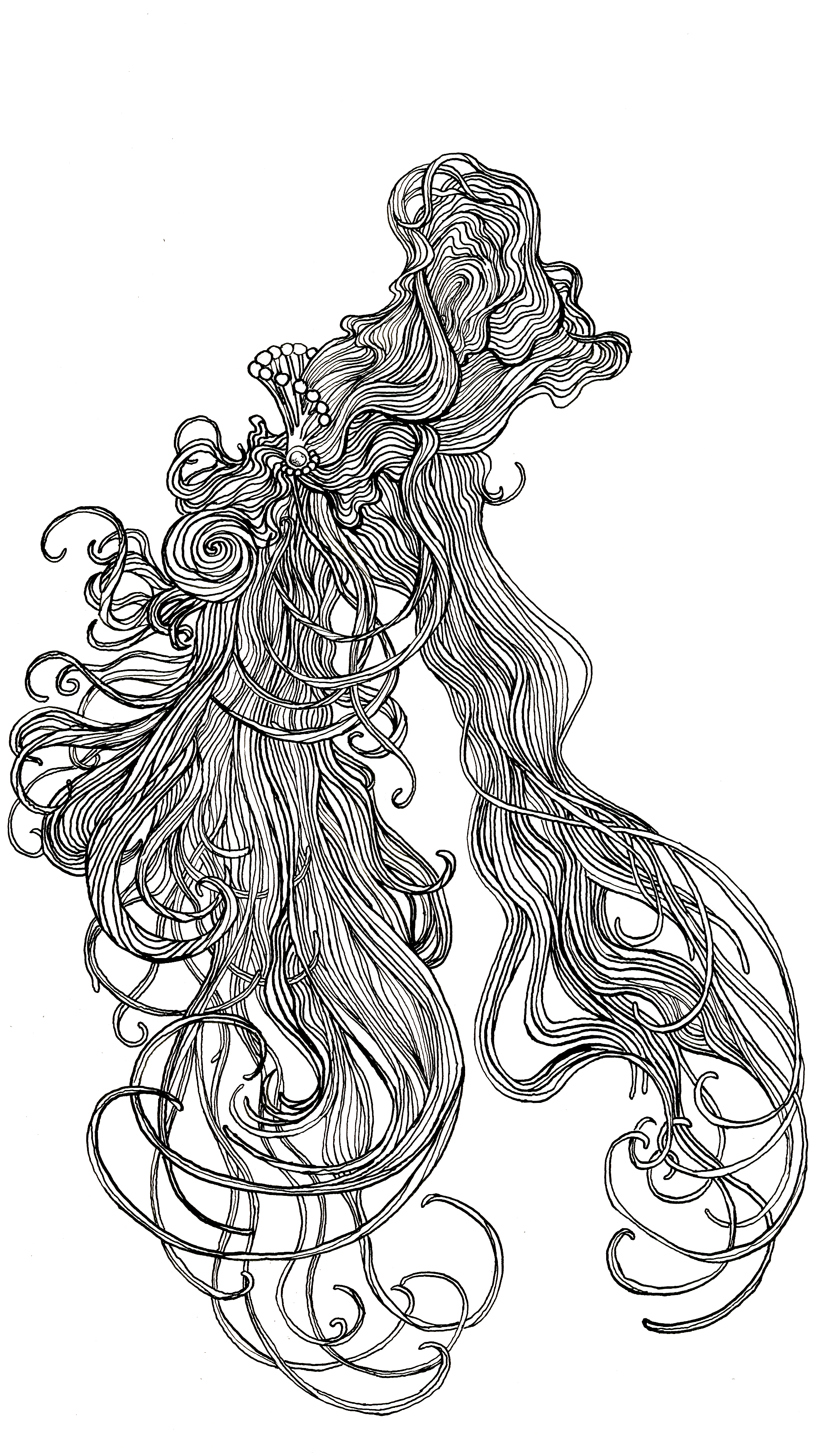Travail réalisé à l’encre de Chine, inspiré des chevelures d’œuvres connues : la Vénus de Botticelli, JOB de Mucha et Relation in time de Marina Abramovic et Ulay